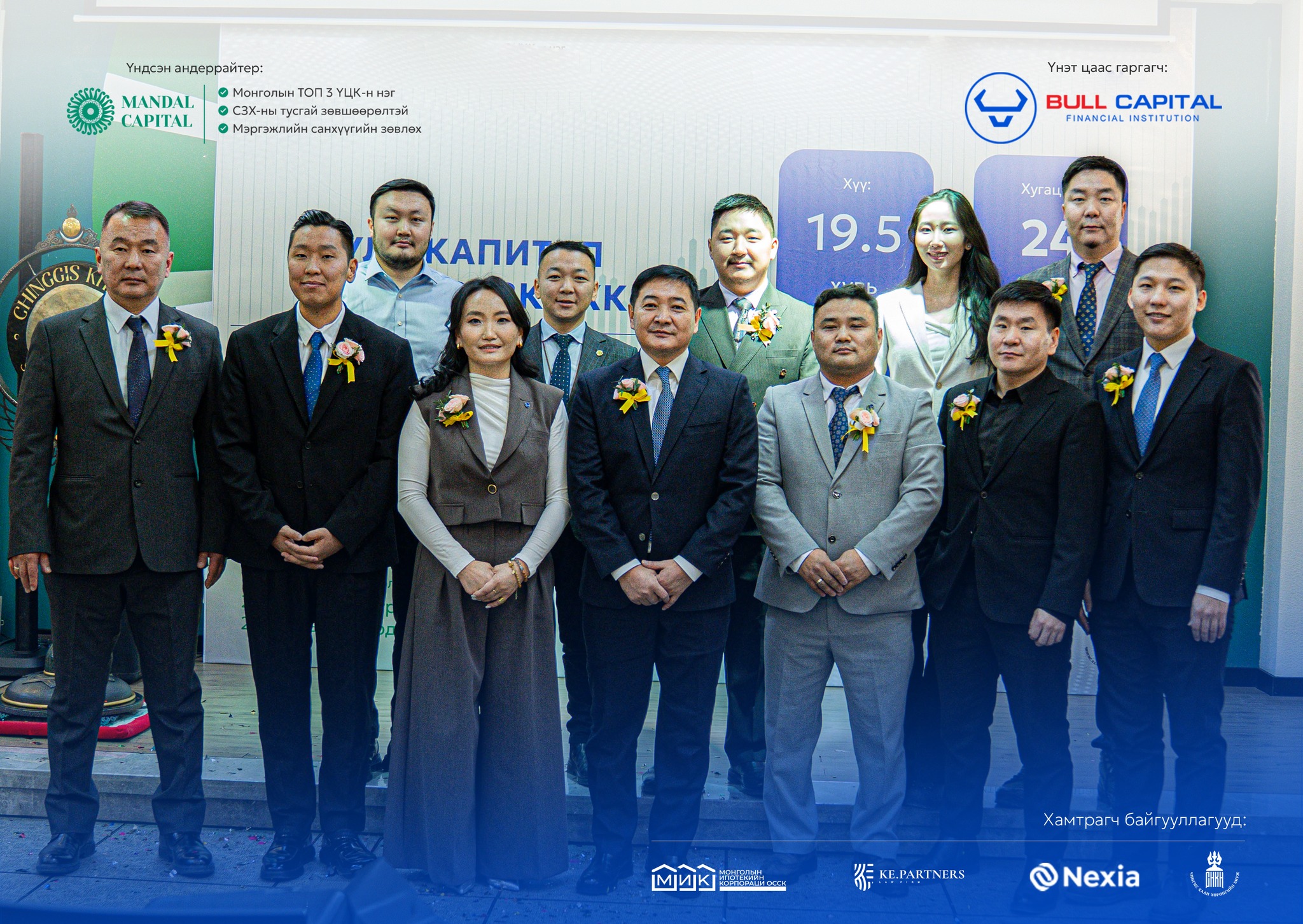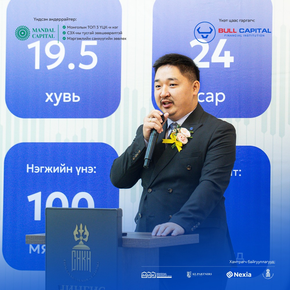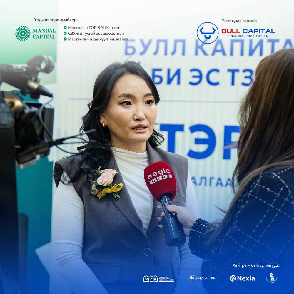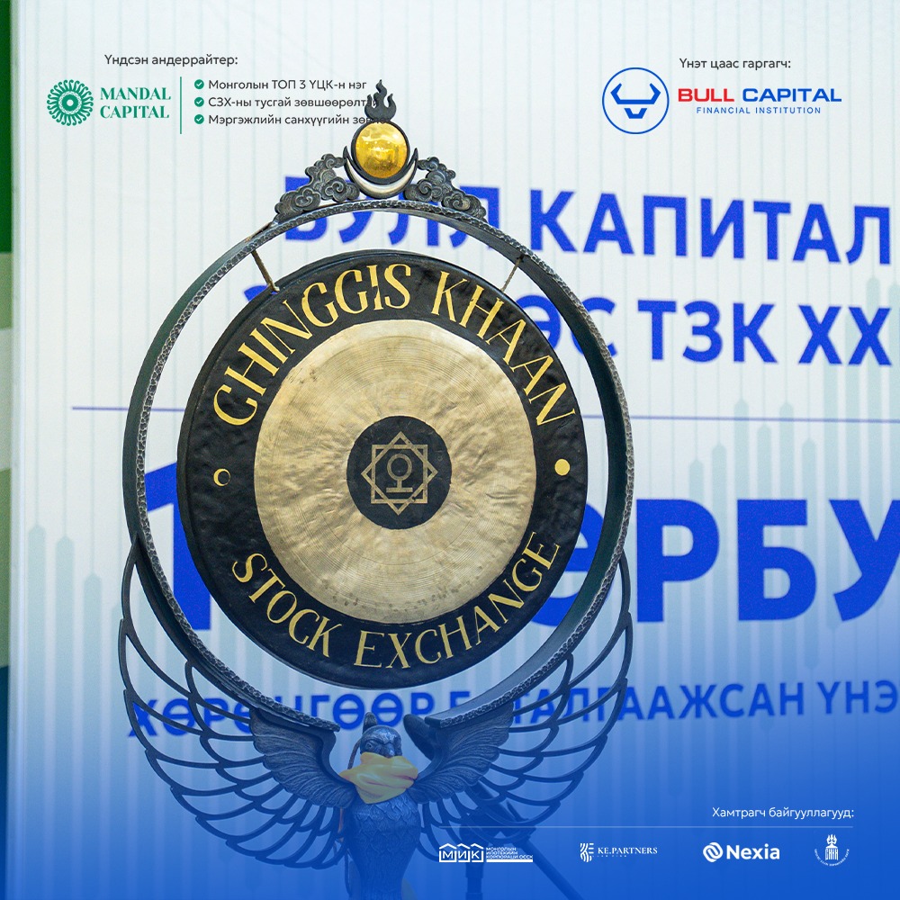 "Булл Капитал ББСБ" ХХК болон Мандал Капитал Маркетс ҮЦК хамтран гаргаж буй "БУЛЛ Хөрөнгөөр баталгаажсан үнэт цаас"-ны анхдагч зах зээлийн арилжаа Чингис хаан хөрөнгийн бирж дээр нээгдэж, цан цохих ёслолыг амжилттай зохион байгууллаа. “Булл Капитал ББСБ” ХХК нь “Булл Капитал Эй Би Эс ТЗК” ХХК-иараа дамжуулан 18.0 тэрбум төгрөгийн зээлийн хөрөнгөөр баталгаажсан үнэт цаасыг 19.5 %-ийн хүүтэйгээр, 24 сарын хугацаатай, 100,000 төгрөгийн нэрлэсэн үнээр гаргаж байгаа бөгөөд “МИК ОССК” ХХК нь тус үнэт цаасны хөрөнгө итгэмжлэн удирдагчаар ажиллаж байна.